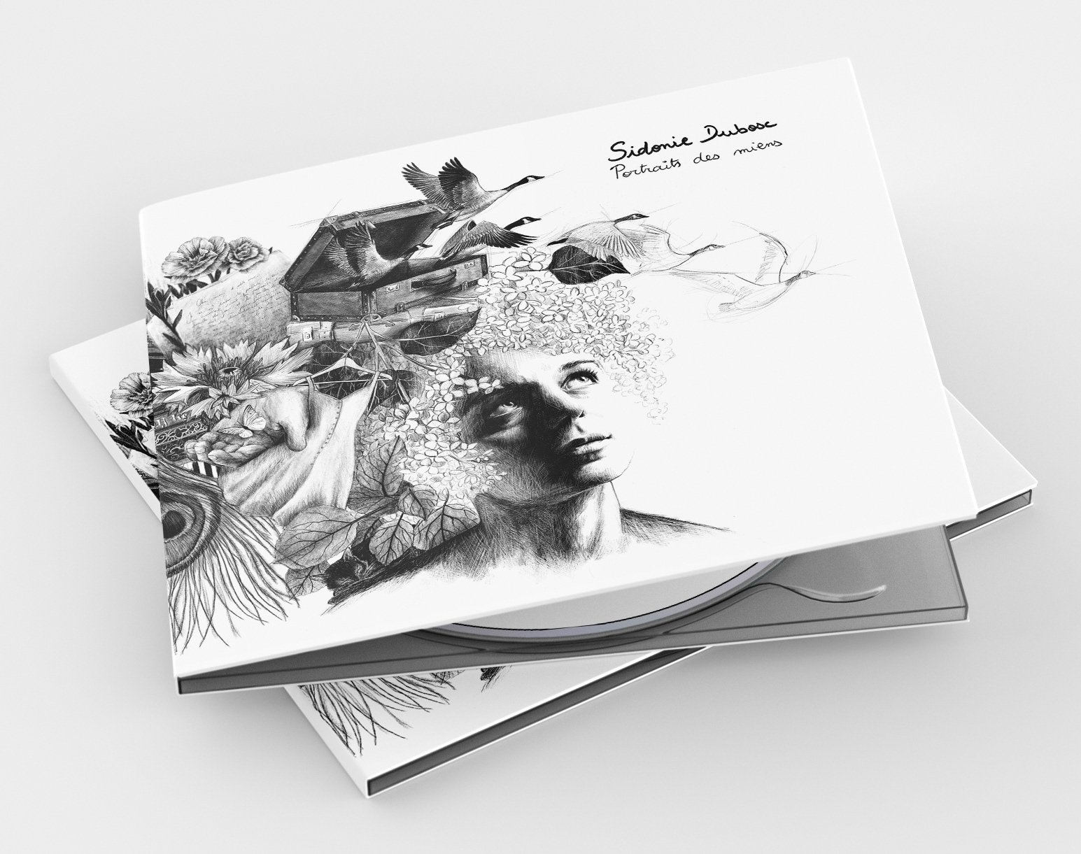 Illustration et mise en page de l'album "Portraits des miens" par la chanteuse Sidonie Dubosc, sorti en 2023 sous le label La Roue Voilée.