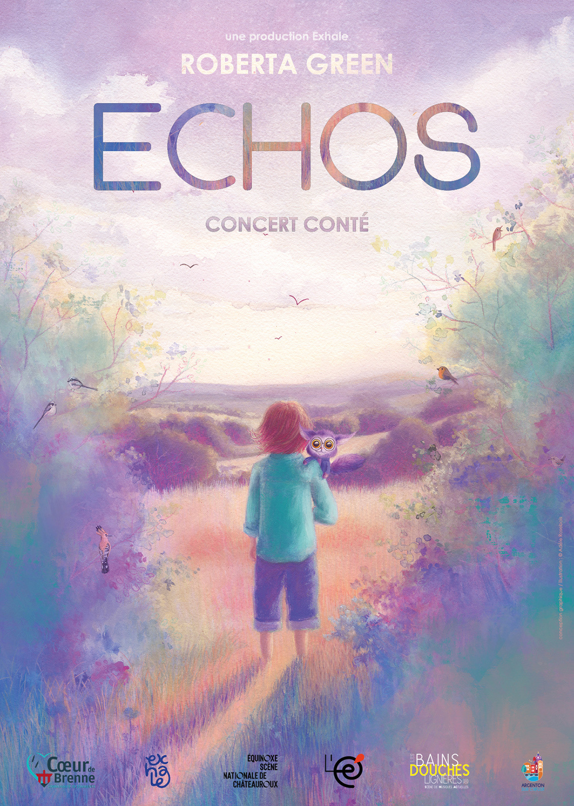 Illustration et mise en page de l'affiche du spectacle "ECHOS" par Roberta Green. Une déclinaison du spectacle en livre est en projet, à retrouver dans la section ILLUSTRATION JEUNESSE.