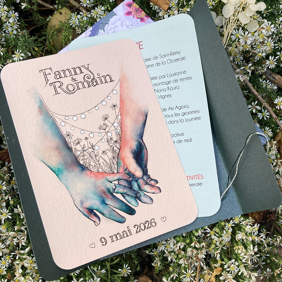 Illustration et design global d'un faire-part pour un mariage organisé comme un festival.